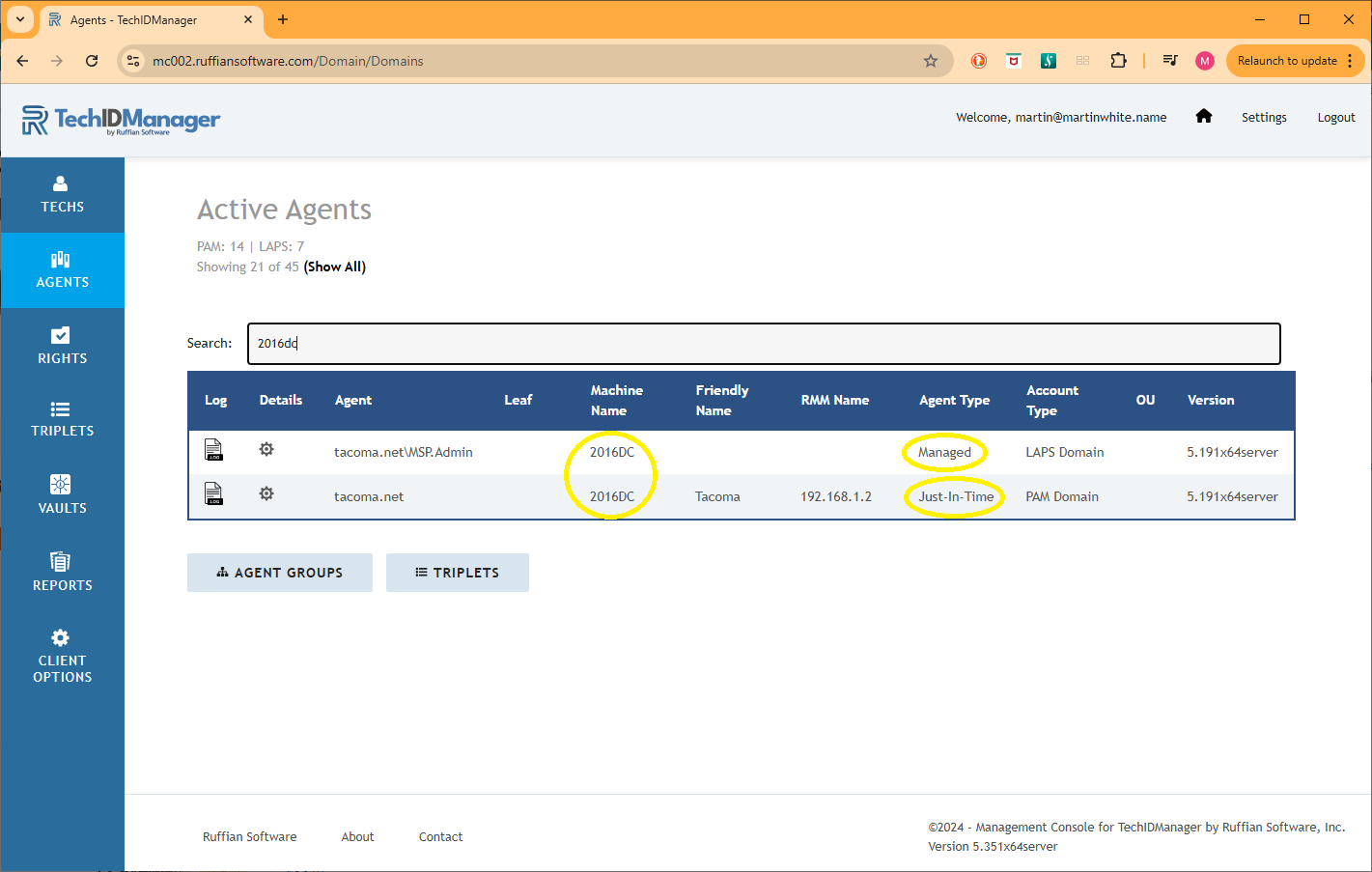 - multiple MSPs having TechIDManager agents installed on the same DC or client machine and each having their own accounts, managed separately.