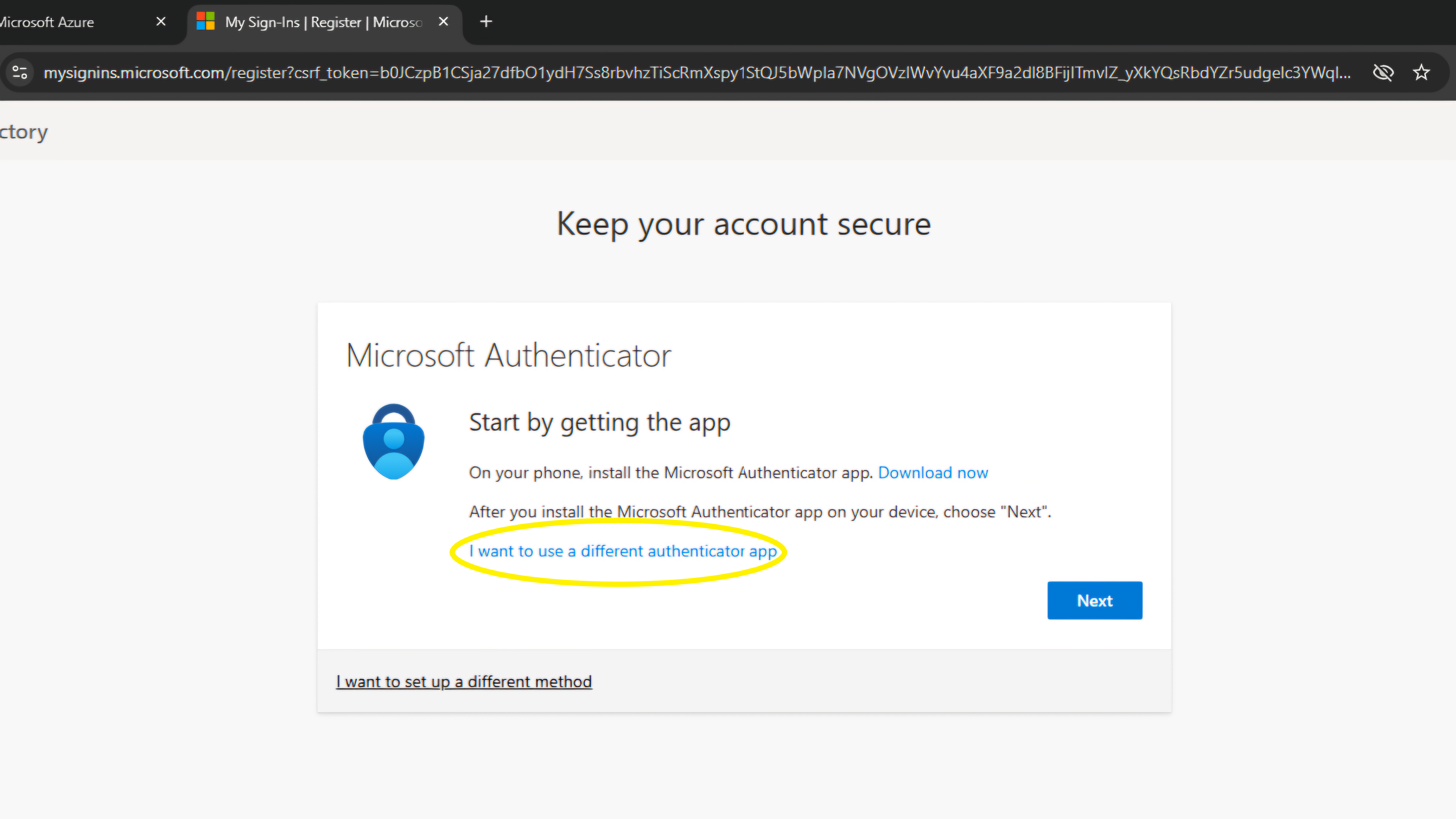 - You will be prompted to setup MFA. Choose the option to use a different authenticator app.