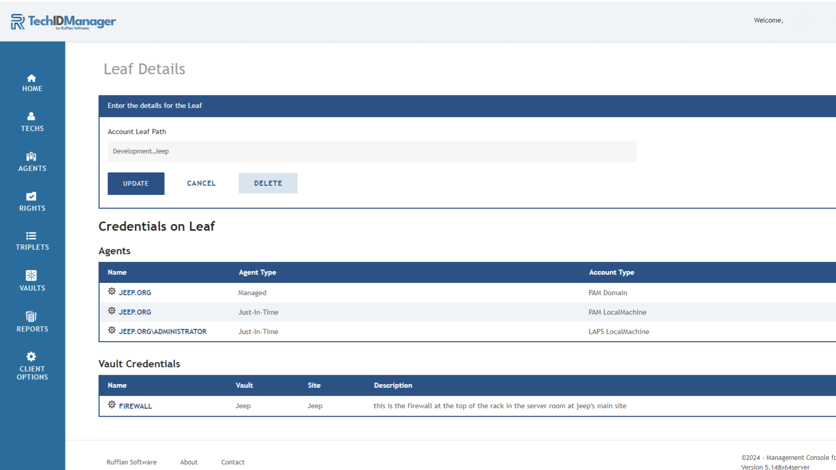 Managers can add, modify, or remove leaves at any time by navigating to Agents → Leaves in the TechIDPortal or by clicking the gear icon next to a specific agent. From there, you can edit the leaf path and view all associated agents and vault credentials tied to that location in the tree.